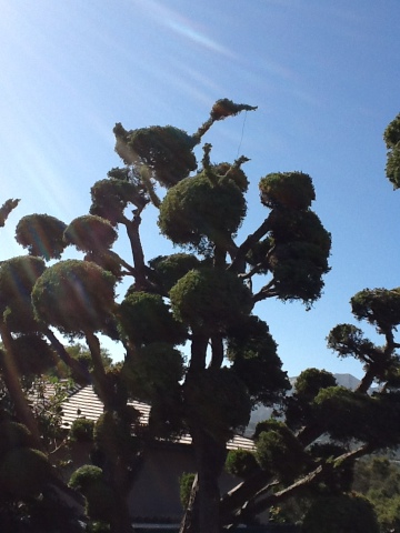 Breck’s godfather is a lovely elderly gentleman who has a home at the highest point in an exclusive area. From one side of his house you see the ocean. The windows on the other side overlook the mountains. Breathtaking! His gardener has a sense of humor as evidenced by the pruning of the “duck tree”!