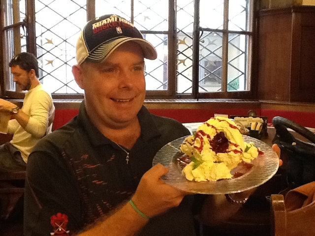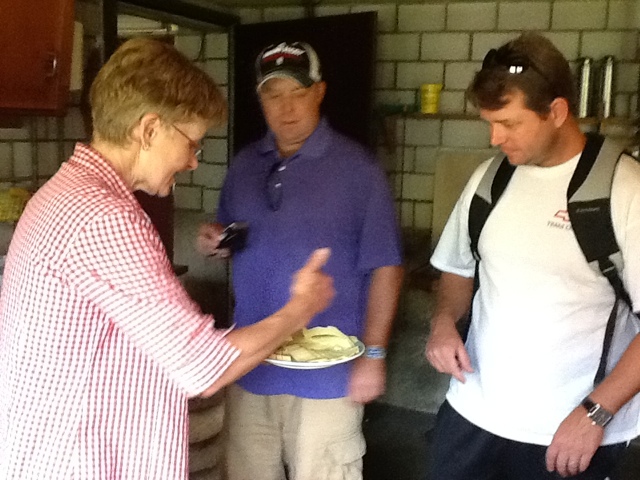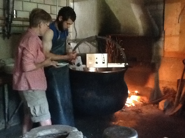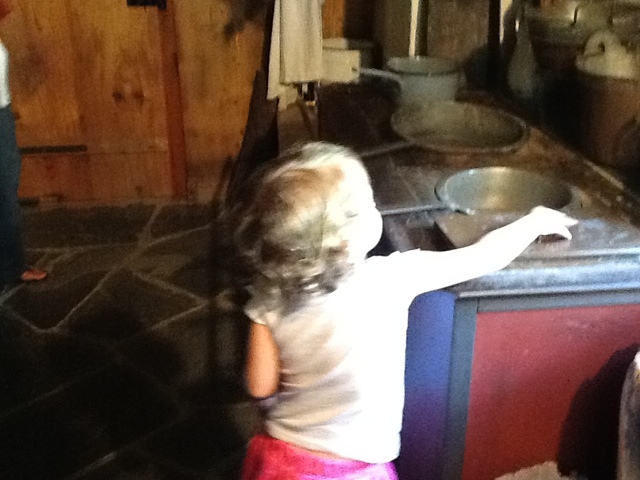 Susanne made us a typical farm lunch. After the milk had cooked long enough on the fire and the cheese wheels had been made, a smaller pot of water was put on the fire. She cut up potatoes, onions, and macaroni noodles and boiled them in the water. She then added the cheese and cream to the pot and “voila”– the best Swiss Mac and Cheese you could ever imagine!! We had a lovely homemade spice cake complete with whipped cream and coffee that was made in a pot over the fire! Quite good actually!