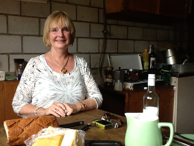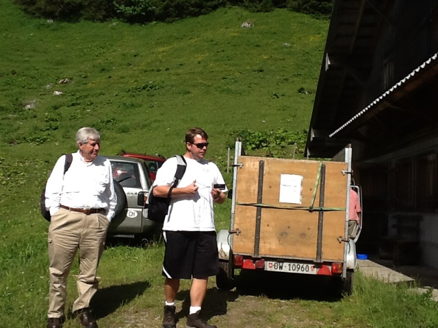 We met our farm family hosts, Susanne and her husband, Alois. They drove us in their cars to the first field up the mountain where the dairy cows are grazing. We had to go today, because tomorrow they are packing everything in the farm house and moving all the animals to a higher pasture where they will graze for June and July. Then the dairy cows will once agin be moved to an even higher pasture for the month of August. In September, they are brought back down to the first pasture where they stay until being moved into a barn in October for the winter. The cows are let out even in winter. They must be milked twice a day. They are moving 52 cows up the mountain tomorrow starting around 4:30 am. They have a young man, Martin, who stays up in the pasture to milk the cows and make the cheese out of the milk gathered the evening before and from the morning’s milking. The big kettle in the photos holds the milk from 24 cows milked last night and this morning. There are 52 cows but not all need milking. They showed us how they make the wheels of cheese. They can make three wheels a day and it takes at least a week of “curing” in a cool room. They sell their cheese in town but we got a lot of free tastes served with freshly made bread and wine, water or apple juice!!