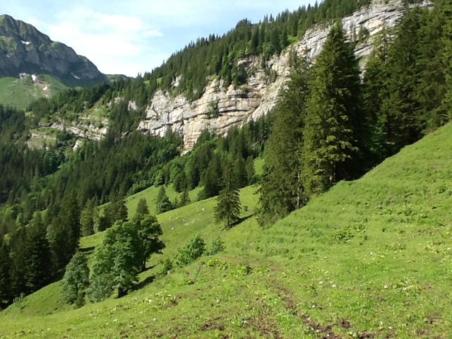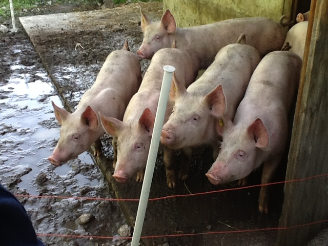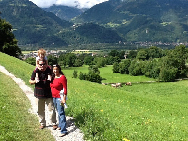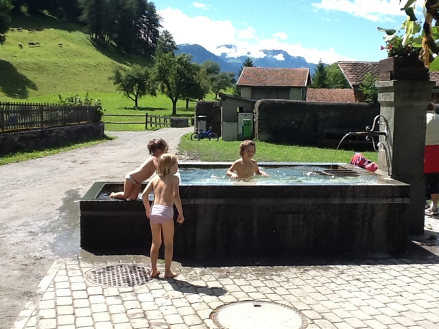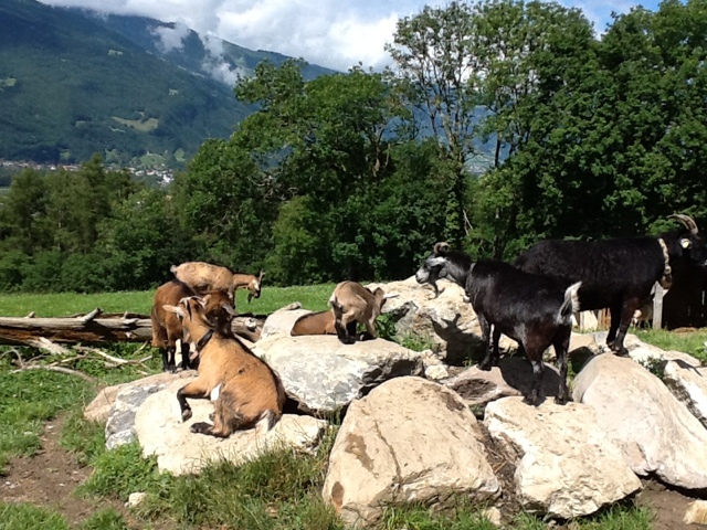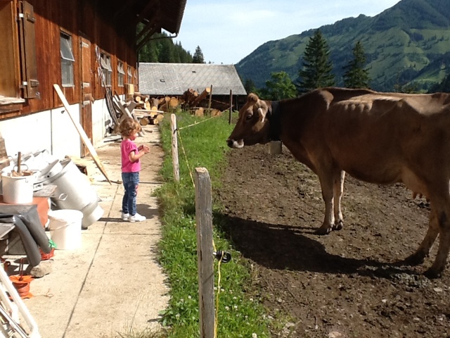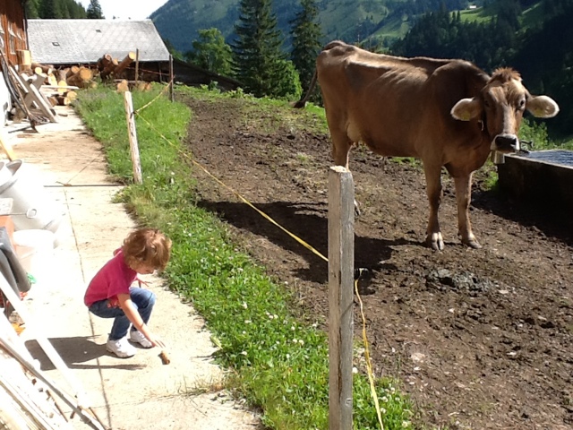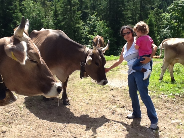 We all loved the cows with the Swiss “bell orchestra” playing every time they move. They were quite close to the farmhouse and we could even pet them!! There was a new 4 month old puppy by the name of Tony on the premises. He will be trained as a new herding dog. There were also several pigs in the back shed which we went to see. The pigs get fed the leftover “milk” after most of it is made into cheese. They use a fermenting agent that they preserve from day to day to help make the cheese. They stop making cheese in October when the cows are brought down for winter. Since the farm is all organic, they sell the milk for a good price in town. Just before we left the farm they took us in one by one to see newborn piglets! Mom was huge and the babies were nursing. It was a little sad to see three dead babies. Mom can’t be messed with right now, but it appears she sat on them. But she had about eight healthy guys all nursing.