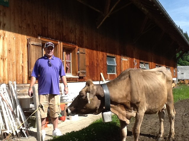 We met our guide, Andrea, and our driver, Claude at 7:00 am this morning for a drive to a real working dairy/cheese farm. It was a spectacularly clear, warm and sunny day! We had a fantastic view of the Alps. We were told there are only a very few days a year where the sky is so clear that you can see all the mountains! So, Swiss weather honored us today.