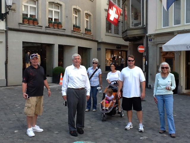Due to all these factors, we were late arriving and then it took some additional time to do a quick change of clothes and shoes for our walk! The temperature was much warmer in Zurich than St. Moritz. We did manage to get a little shopping in before dinner! Chocolates and Swiss watches for all!!
