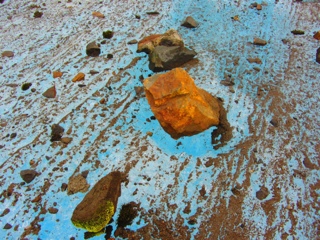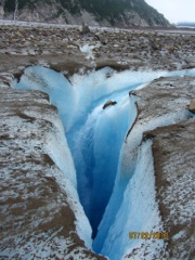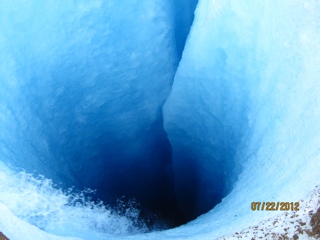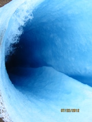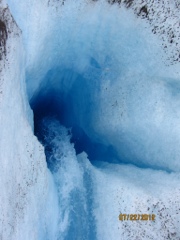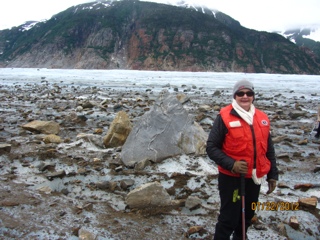 This morning we pulled in to the small town of Skagway for our helicopter ride to the Mead Glacier. Duffy came with us later in the day on another helicopter trip I’ll tell you about in a minute. Our morning trip to the glacier was awesome. We landed on a Morain ice field. It was not snow packed. It was an ice field strewn with crumbled rocks of all sizes and shapes! From the air, it looks like there are tire tracks down the middle of the glacier. Those are the rocks that are being ground up as the glacier retreats. The glacier we were on combined with another glacier up the valley and has created these “tire-like stripes” down the middle of the ice field. The tire stripes are the rocks You can even see “walking rocks”. These are rocks/boulders of all sizes that absorb heat from the sun and melt more of the ice around them, but not directly under them. Eventually, the little column of ice they are sitting on collapses and the rocks roll across the ice where the process starts again. It takes 100 feet of compacted snow to make one foot of ice on a glacier. We were given boots that had crampons in them so when you walk they dig into the ice. A guide led us across the Morain and we were within a couple of feet of crevasses that went down 150′ and more than 250′ our guide said. He actually threw a couple of good size rocks down the crevasses and it took forever to hear them hit the other rocks and water below! I actually couldn’t believe they let tourists get that close to these crevasses! We got some amazing photos! Bill was braver than I was walking close to the edge. They did give us walking sticks which were a great help navigating the ice field and the small streams of rocky water!!! I thought that was going to be the highlight of the trip until a little later this morning.