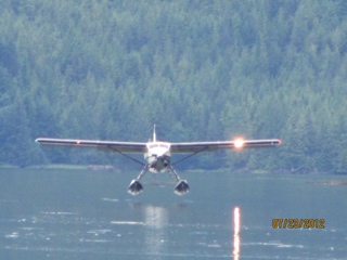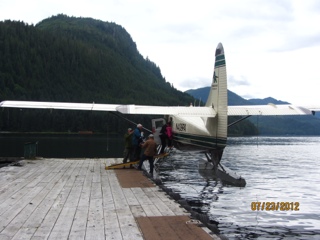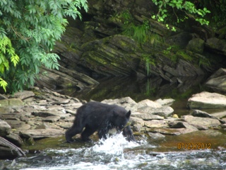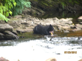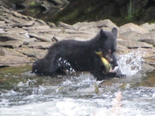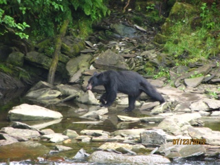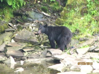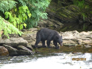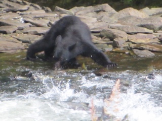 But the BEST part of the day was seeing two black bears come salmon fishing!! Actually, there are SO MANY hundreds of salmon churning the water in this small stream that the bears don’t even have to work! It’s ( excuse the metaphor) “like shooting fish in a barrel”! I shot a video of one of the bears that catches an enormous salmon and carries it to the shore and then leaves it there flopping around. It seems the bears get very particular because there are so many salmon, they only want females that are full of eggs. So the bear abandoned the male salmon on shore when he discovered there were no eggs to be had. So he went fishing again and we assume he scored a female with eggs because he carried the second salmon off into the trees to eat! It was a totally awesome experience! Our float plane trip couldn’t have been nicer.