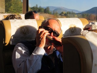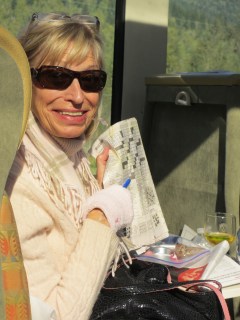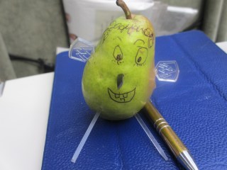 PS I do have to explain the “Pear photo”. A gentleman dropped his camera and broke a small plastic piece off of the camera. Annnette diligently looked all over for the missing sliver but to no avail. After the front of the car went down to lunch (did I mention there was even an elevator in our car?) Annette searched once again and was successful the second time around. We decided her “find” deserved a special presentation for the gentleman — hence , Mr. Pearman whose nose is the missing camera piece!!!