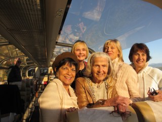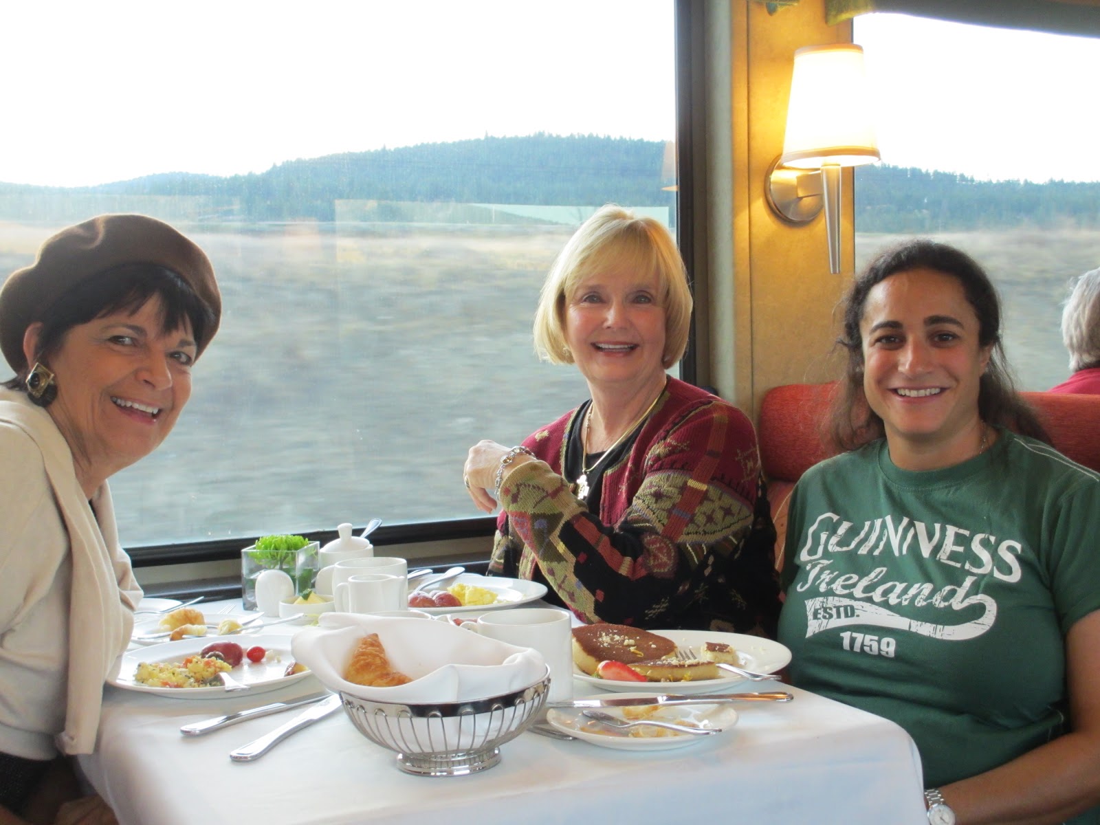A quick word about the cuisine aboard the Rocky Mountaineer Golf Leaf service. It was SPECTACULAR! Not sure how that tiny kitchen could turn out so many beautifully prepared meals.. There were always at least five choices on the menu — AND THE DESSERTS!!! They were so yummy! Even those who wanted to resist didn’t….