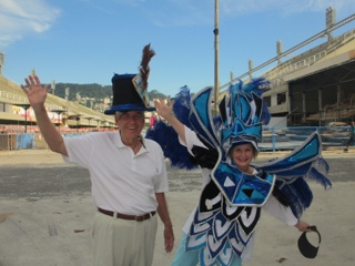 There is an elderly gentleman who for the last few years stakes out a corner by the stadium after Carnival. He collects discarded costume pieces and you tip him to try on a few of the pieces! Even the small pieces I wore we’re very heavy. The very elaborate costumes that the Samba schools do in the competition at Carnival weigh a TON! Don’t know how those ladies do it! They do train all year for these four nights!