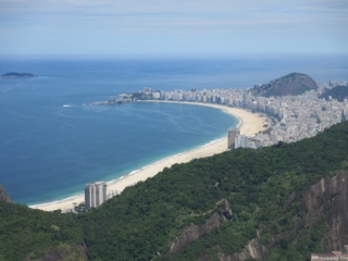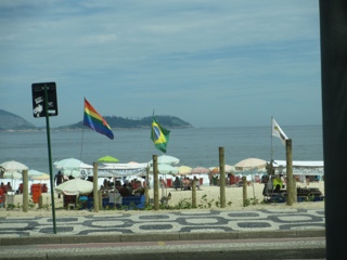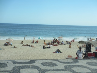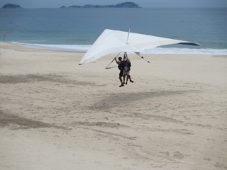 I managed to do a little souvenir shopping for important friends and family and then we were off to drive by the famous beaches of Ipanema and Copocobana! Even on a Monday with school already back in session for the winter season, the beaches were lined with umbrellas and beach goers in the morning… Later in the afternoon, the confetti colored umbrellas were 6 lines deep on the same beaches. We saw a few surfers and several hang gliders. The hang gliders have the perfect mountain to jump from and a beautiful, wide and unoccupied section of beach to land on!