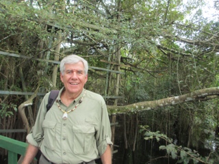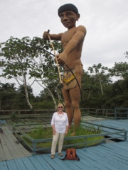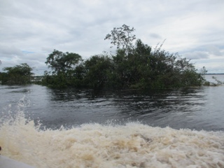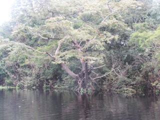 We took a boat ride to the entrance of the Rio Negro — one of the major tributaries for the Amazon. Actually, the Rio Negro is geologically a lot older than the Amazon River. It is in an area that is the least populous of the Amazon region– and this includes the large city of Manaus with 2 million people. Even with Manaus in the count, the region along the Rio Negro has less than one person per two square miles!! It is a river of black water. During the rainy season it rises , on average, by about 46 feet. They have seen indigenous Indian tribes in the area by plane, but these Indians have never met anyone from the outside world. They are not even sure what kind of Indians they are. There is a photograph, taken from the airplane, of one of these villages and the men are attempting to shoot down the airplane with bows and arrows! Another interesting fact is that there are no mosquitoes in this region. The black water is too acidic for the mosquitoes to survive. There are a very few variety of fish that survive in the acidic flood waters. They eat the fruits off the submerged trees when the floods begin.. These fish develop a large layer of fat. They live off their fat in the dry season when the flood waters recede from June until November.