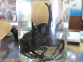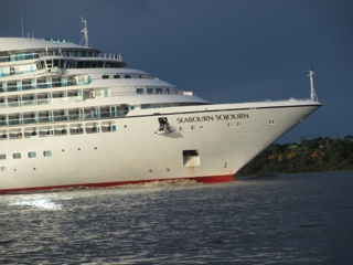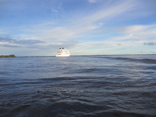 We were so late getting back to our ship, that we actually missed the ship!! Our guide was very talkative! We were supposed to be back by 5:00 pm because our ship was up anchoring and repositioning. We saw Sojourn go sailing past us and we had to chase her for about 45 minutes before she stopped to anchor. She was repositioning for a Beach Party dinner on the shore. While it looked like it might be nice, we ended up getting back so late we decided to eat on board instead of doing the beach barbecue. The skies looked threatening and the bugs looked huge ! One of the photos below is of a Rhineocerous Beetle, found only during the wet season! We opted for the quiet of the main dining room and AC, and bug free!