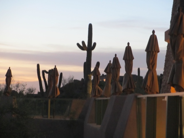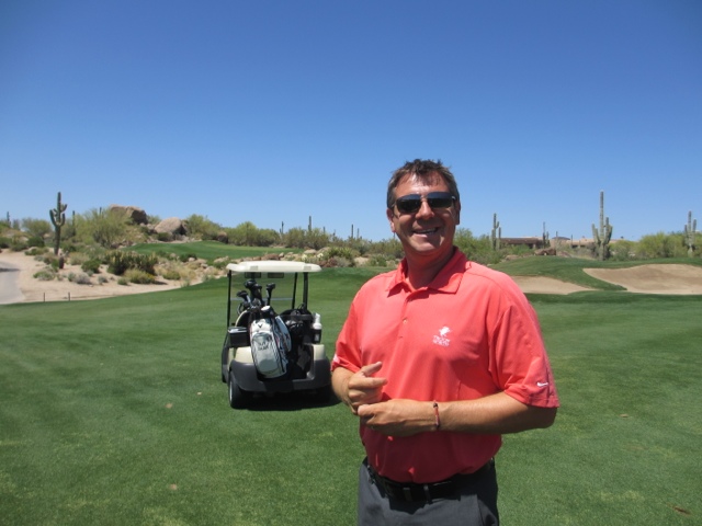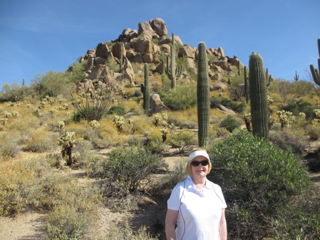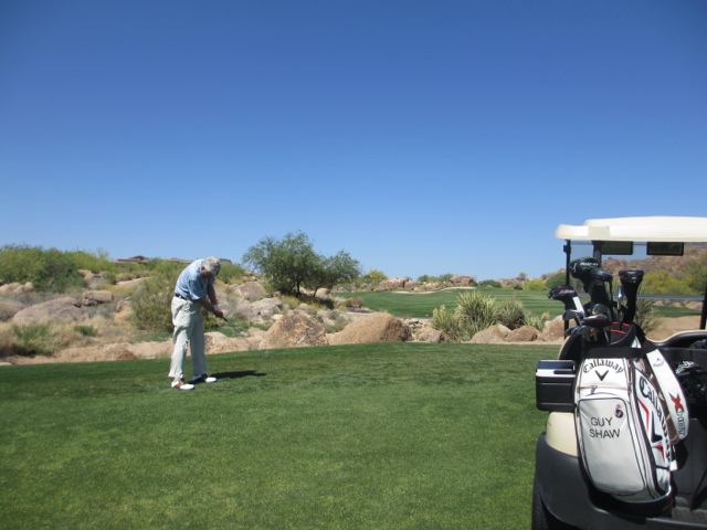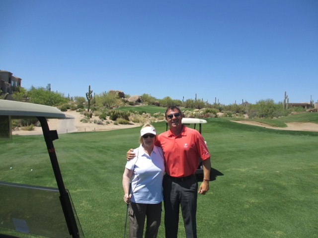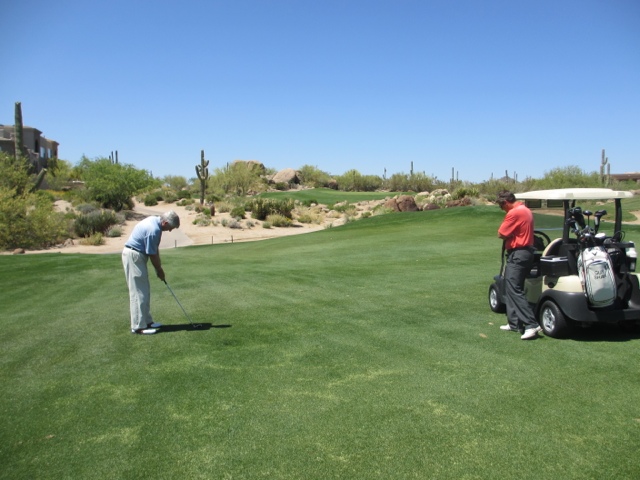 I must not neglect to tell you how lovely this Four Seasons Resort is. There is something for everyone here! The landscape is SO different from Florida but just as beautiful in its own stark way! We actually saw a Road Runner dash across the edge of our putting green — and yes, they do actually go “Beep! Beep”. We’ve had rabbits that are so intent on chewing the tender green grass of the golf course that they are 4′ away from you and not the least bit worried. We’ve seen lots of lizards and we’re told the Bobcats come out with their kittens in the late afternoon at this time of year. One other important note, I’m sure the thermometer read somewhere close to 97 F or 98 F, however, the number on the thermometer does not equate to comfort on the course. There was actually a cool breeze on the range this morning. The heat has never been an issue at all while we’ve been here! What a difference the “dry” heat is from the humidity of Florida!!