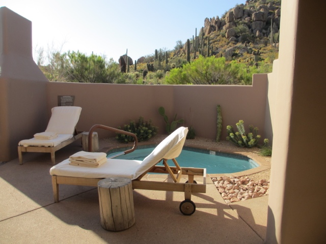 My sweet husband arranged for an 80 minute massage every day we’re here! Good thing he did that since several of my muscles have been complaining!! Our “casita” is lovely. We just had them light the fireplace on our patio! Lovely patio area with a “plunge pool” and outdoor fireplace. We also have a fireplace in our sitting room, though that one is electric! This is a beautiful “get away” resort for anyone of any age! Even though the temperatures have reached 100 F here for the last couple of days, you don’t really mind. That whole thing about “dry heat” seems to be true. It has not been unpleasant on the golf course– even with those temperatures. It is much worse in Florida on an 88 F degree day. We’ve had so much fun and learned so much about golf that we might have to come back “annually ” for golf “tune ups!”