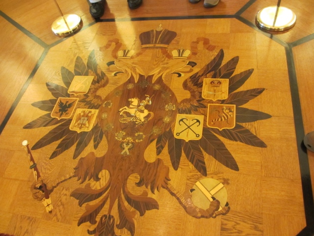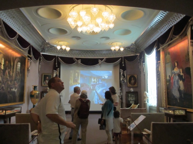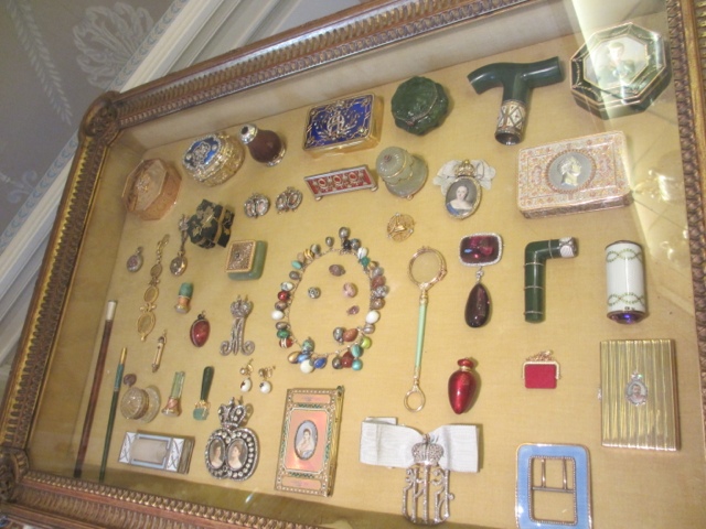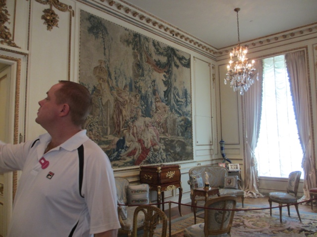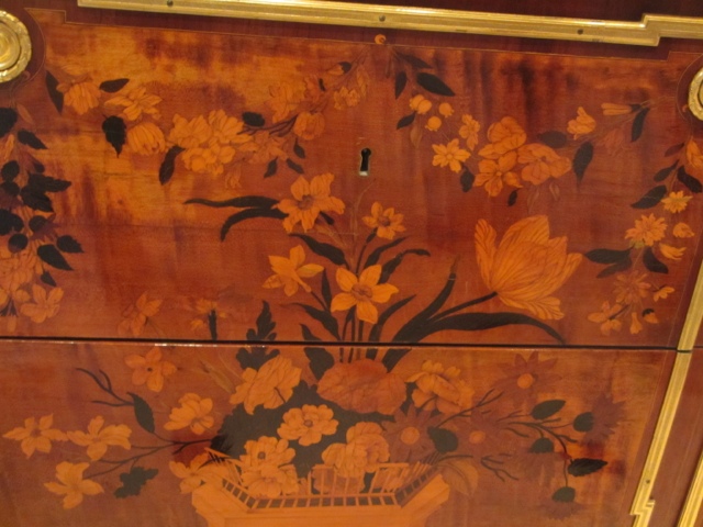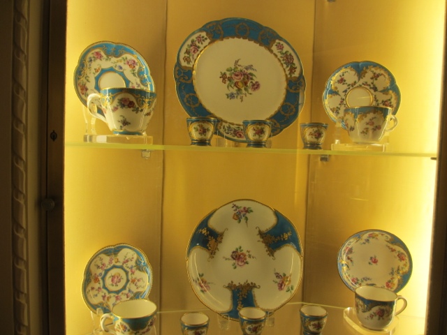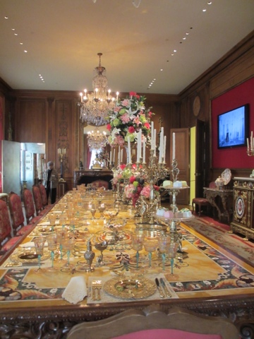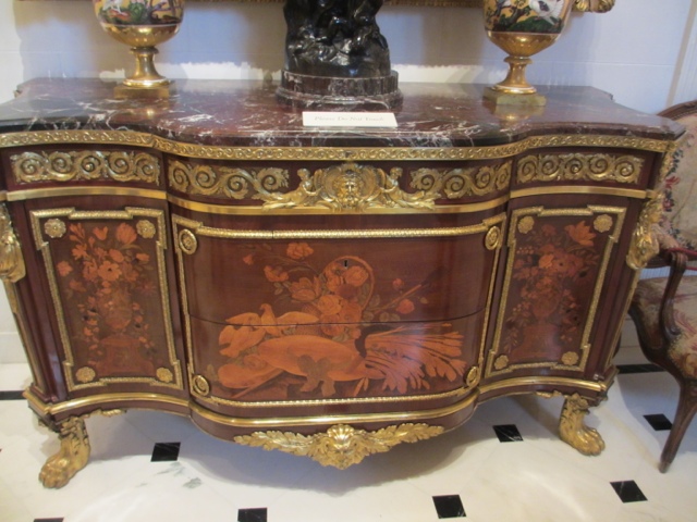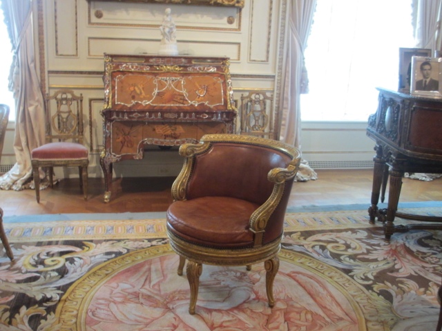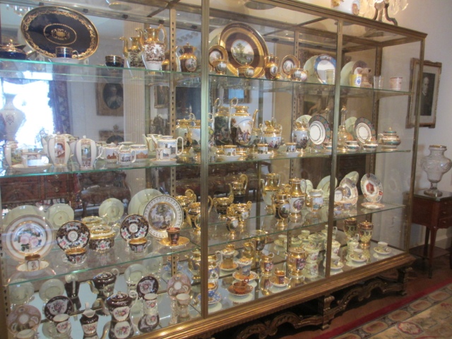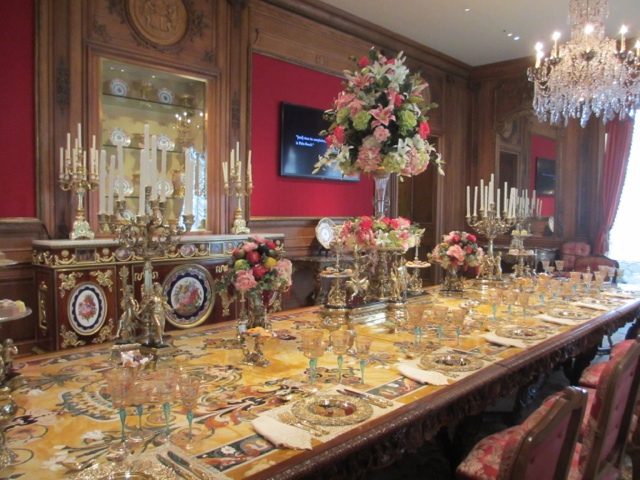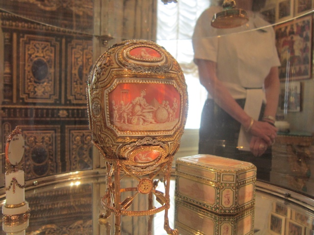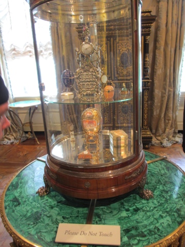 There are fabulous treasures in each room of the estate, including two of the 13 Faberge Eggs that exist in the US. (Photos below). She collected fantastic porcelains, including four 30 piece dessert services that belonged to Catherine The Great. The table in her dining room was originally designed in 1927 for her dining room at Mar-A-Lago in Palm Beach. It was requested in her will that the table with 6 leaves ( takes 6 people to Insert sent a leaf in the table since they each weigh about 400 lbs) be returned to Hillwood after her death. The table seats more than 30 people with all the leaves in it. It has a mosaic top of more then 11 different stones.