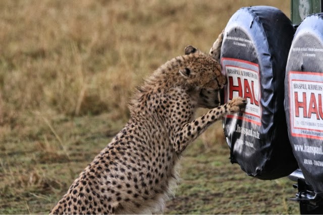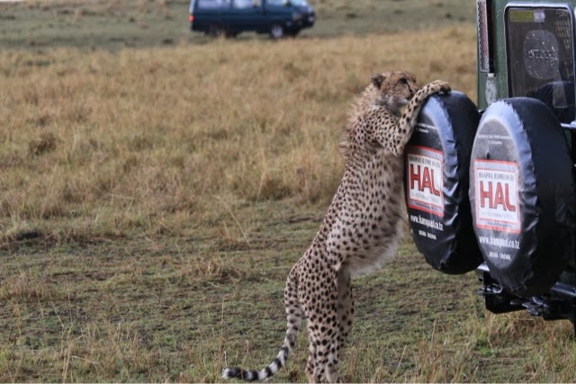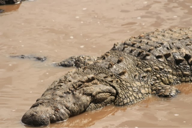 We saw tons of Hyenas several lions and a VERY curious young cheetah who came up to the back of another vehicle and started chewing the spare tire!!! We thought he was going to jump on t, but he was content to rip the tire cover! We saw several GIGANTIC crocodiles!!! They were just so prehistoric looking it was unbelievable! We did see the crocs feeding on a recently deceased Wildebeest who didn’t make it across the river. In addition to the depth (deeper then usual at this time of year because of the early rains) and the very swift current, there are large crocs just waiting for their dinner which makes it very dangerous for them!