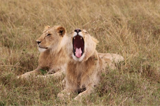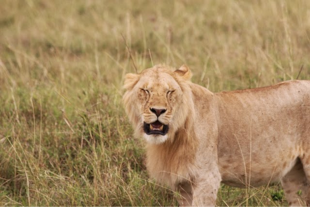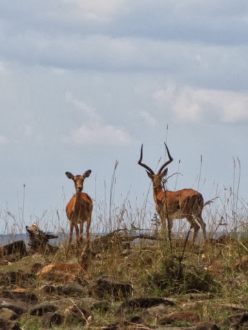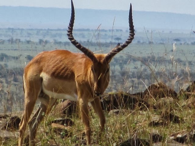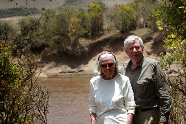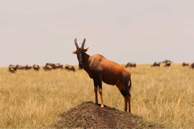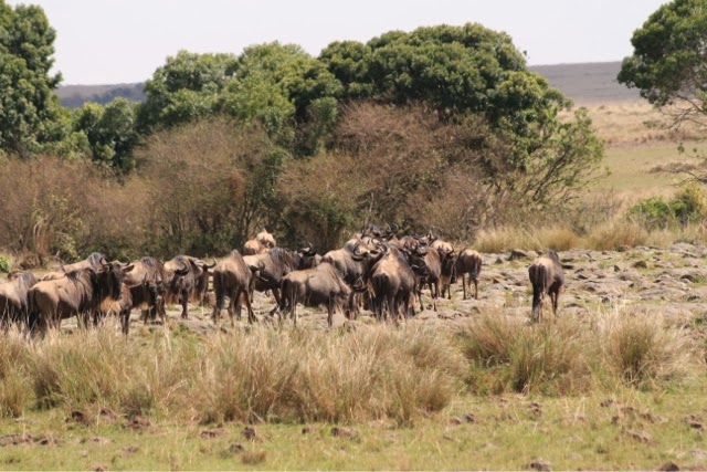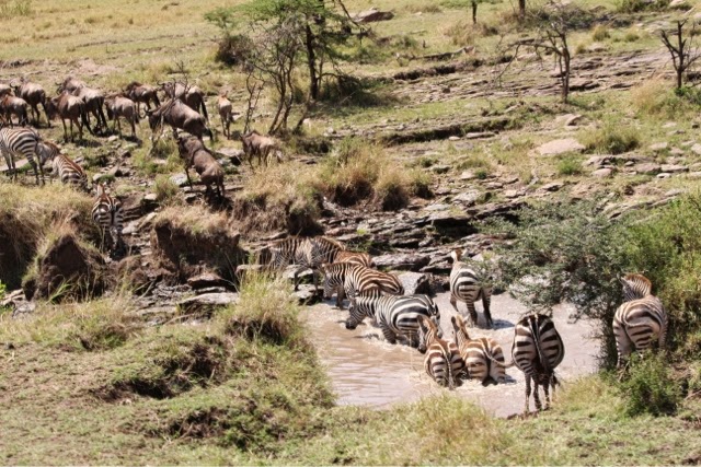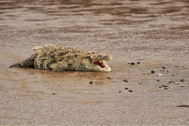 I had publishing issues last night so I’m also going to tell you about today’s game drive to the Mara River. We spent a long time watching a small herd of Wildebeest decide if they were going to cross the dangerous Mara River. They went to the edge three or four times, but never leaped. They were spooked by two enormous crocodiles. We did see four female elephants cross the River with two babies. One of the babies was too small and we thought it was going to drown. The mother was frantic! They all made it but I don’t know how the one little guy did it. The River was way too deep and swift for him! All you could see was his little trunk going up and down as he was tossed around!