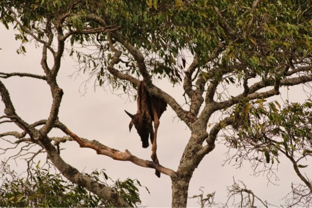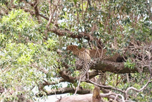 On our return to camp, we had a great game ride. We saw a 12 ‘ crocodile, hippos galore and lions. Grant also made an extremely rare sighting of a Rhino! We even saw the kill of a leopard that had been hauled high into a tree to protect it…grant is getting really good at spotting the animals!!! Even the guide was impressed!