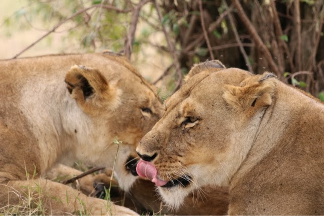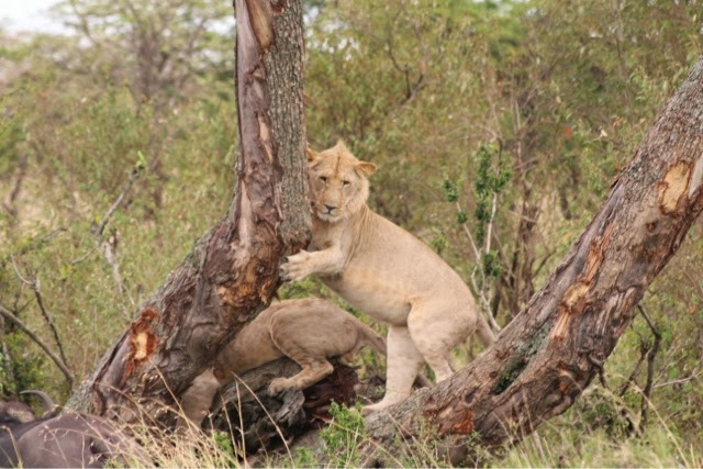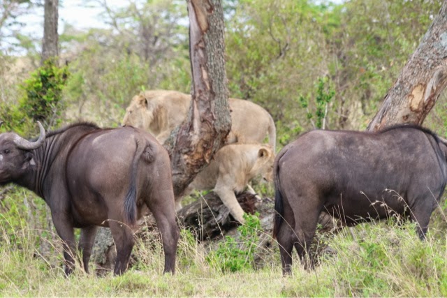 One of the MOST amazing things we saw today was two young male lions who started out hunting. They hid beneath bushes thinking about a small baby Cape Buffalo as a meal. They changed their minds, but the head of the herd saw the two lions and started to charge them!! Then the rest of the herd came running and they chased the two lions into a tree. The Buffalo really tried to get them, but they were just high enough that they couldn’t quite get them. One of the lions stood on top of his brother for a short time trying to stay away from the Buffalo. It became a Mexican standoff and eventually the Buffalo left. The lions came down and went on their way.
