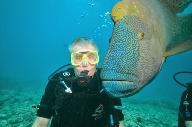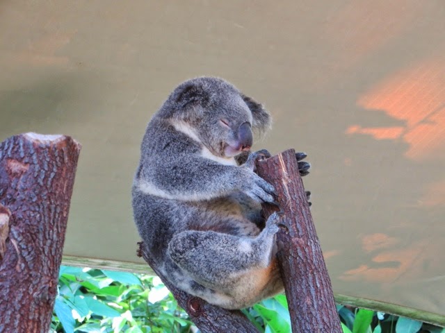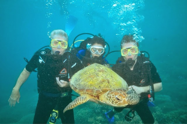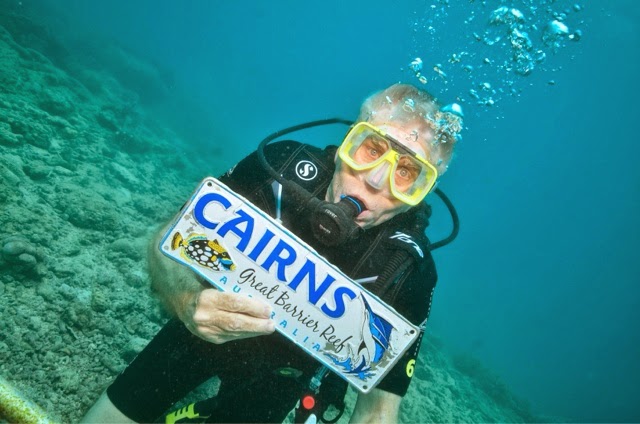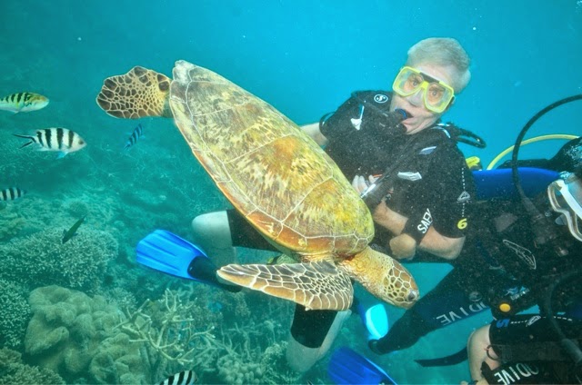 Well, the dynamic duo ( that would be Bill and me) split up today to enjoy two separate tours. I snorkeled the Reef about 50 years ago with my parents and had no real desire to do it again. I was all for seeing the Koalas and getting to hold one. Bill wanted to see the reef so he went out expecting to snorkel, but found out he could scuba dive with an instructor without a dive certificate. He had an absolutely amazing time as you will see in the photos below. There was an encounter with a Loggerhead turtle and a rather gentle giant of a blue fish (we’re unsure of its name).