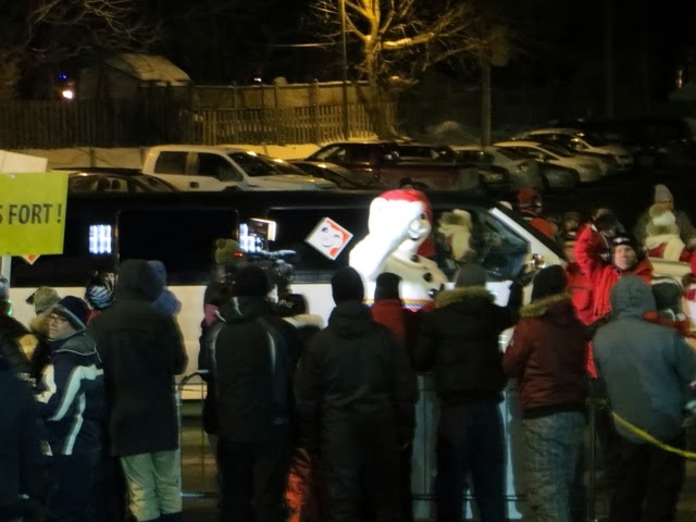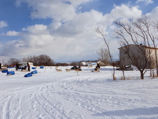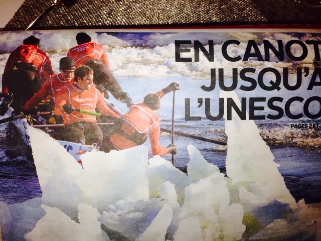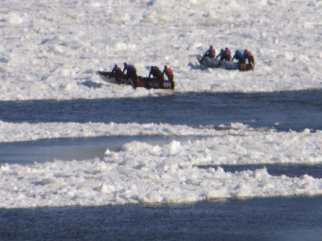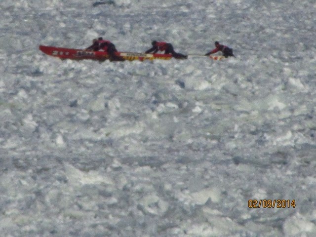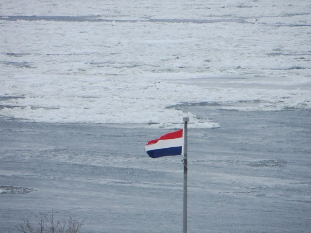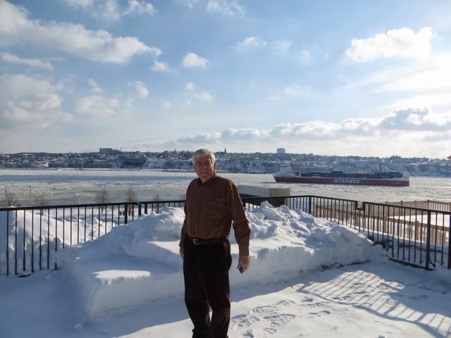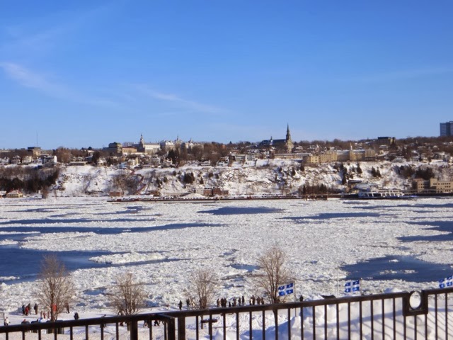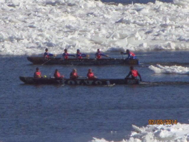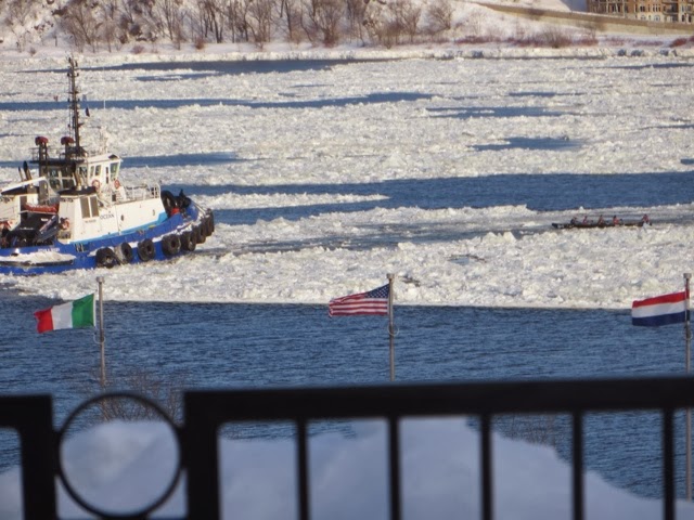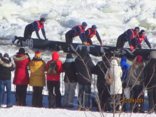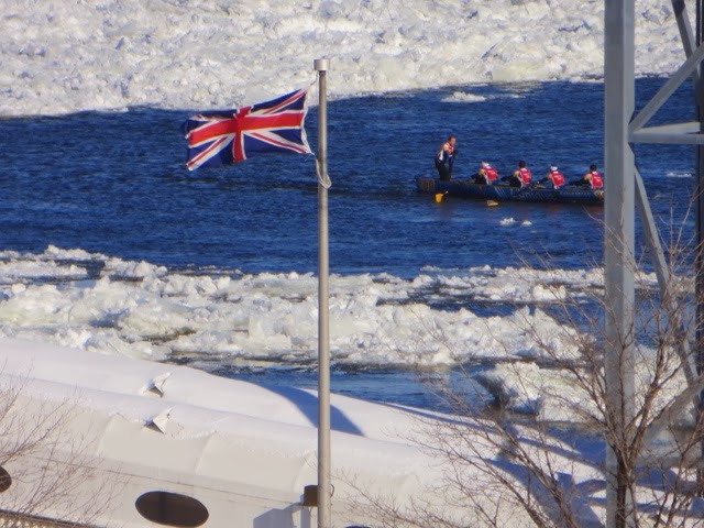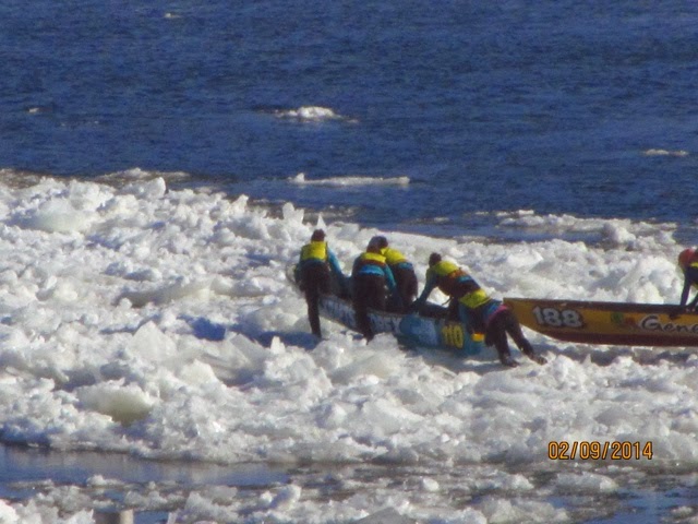 Today was a lazy day for us. However, this was the day of the GREAT Canoe race across the icy St Lawrence! I think these guys and gals are crazy, but they all competed in 9 degree windy conditions to cross the icy, mostly frozen, St. Lawrence River! This is the most important event of Carnival Week! This has to be the most grueling and dangerous sport I have ever witnessed! One canoe did get in trouble and an ice breaker went out to help clear the way. The crew seemed disoriented and was kind of steering all over the place! They did get back safely. When they are in the canoes, they cannot see where there is water and where there is an ice flow. They are not allowed spotters to help them choose an ice free route across the river and back. We are not sure who actual won because we think it is time trials. There were several groups of about 12 canoes that made it across and back! Note how they get one foot out of the canoe when they get stuck on the ice! They all push to get the canoe off the ice. If they are stuck in a smooth patch of ice it didn’t look too bad, but when they got stuck in an area that had “rough” ice it was a whole different story ! I can’t imagine how they can endure these conditions. There was a very brisk wind, as you can see by the flags! Some of the photos are blurry, but I’m posting them anyway so you can get an idea of what they were doing! We were able to watch most of the race from our hotel room window since we overlook the St. Lawrence ! Wherever you were today, I guarantee these guys were colder then you were!! I admire them, but not sure how much I credit their common sense! And, you will notice, there were women racing too! The race originated years ago amongst local families. The winner was to get the postal contract for delivering mail to the other side of the river!