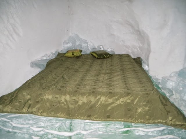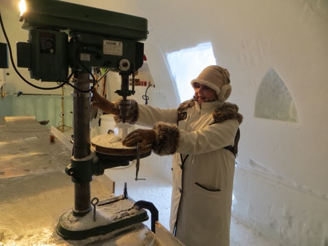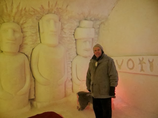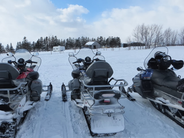 The day started off with a snow mobile ride! And you know what, it’s just like riding a bike! Neither Bill nor I had any trouble keeping up with the guide! This, in spite of the fact that the last time we did this was close to 30 years ago in Wisconsin at a place called Eagle River! I was keeping my eyes on the guy in front of me, but the one time I checked the speedometer when we were on the flats, we were doing 74 mph! We had to stop frequently because we had several people who were VERY cautious and kept getting very far behind! The guide was a little frustrated because he had to keep circling back to be sure they were ok! It was a beautiful sunny day and the trails were well groomed with great snow trails! We went through woods and had plenty of time on open flatlands to “let it rip”! They were doing dogsled rides out of the same establishment so you will see the dog sled camp in some of the pictures!